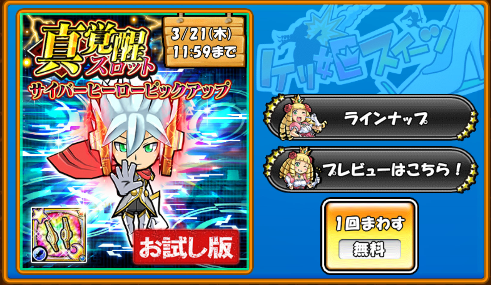 お試しスロットを回しました。大当たりではありませんが、やはりまたまた貴重な武器が出てくる状況です。......。あとは...これといって別段特筆すべきことがないのは寂しいですけれど。あ、もちろん美味しいイベントが無いわけではありませんが少し弱いかなとは思えます。はい。イベント的に。ただ毎週毎週ビッグイベントというのは無理ですものね。はい。毎週少しでも変更があることに有り難く思うのみです。とは言え、始めたばかりのかたが遊ばれるには広大過ぎるほど遊び場がありますので、やはり今からでもお遊びになられることをオススメ致します。是非ケリ姫スイーツをどうぞ。