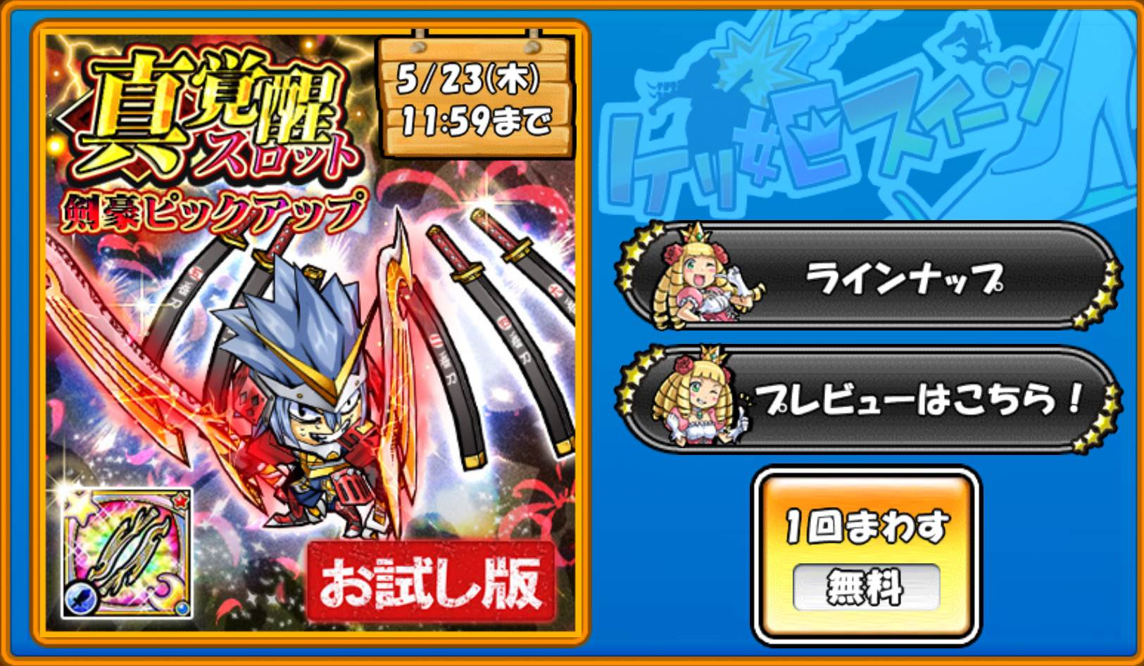 はい。昨日の更新でお試しスロットが新たに追加されておりました。結果はスクリーンショットをどうぞ。こうした普通に強い武器が無料で貰えてしまいますから、もうもうマメにマメーに毎週スロットをされて下さいませ。ええ、そうなのです。ほぼ毎週お試しスロット回せますので。絶対に早めから遊んでましたほうが得なわけです。何度も何度も書いてはおりますけれども。書くことが別段無いからではなく、ほんとに毎週オススメしたいのでした。最高級の武器も当たっちゃいますしね。過去の日記に投稿しております。そのようなわけでして、またまたオーソドックスにオススメしましたが、はい。オススメです。ケリ姫スイーツを是非ダウンロードどうぞ。