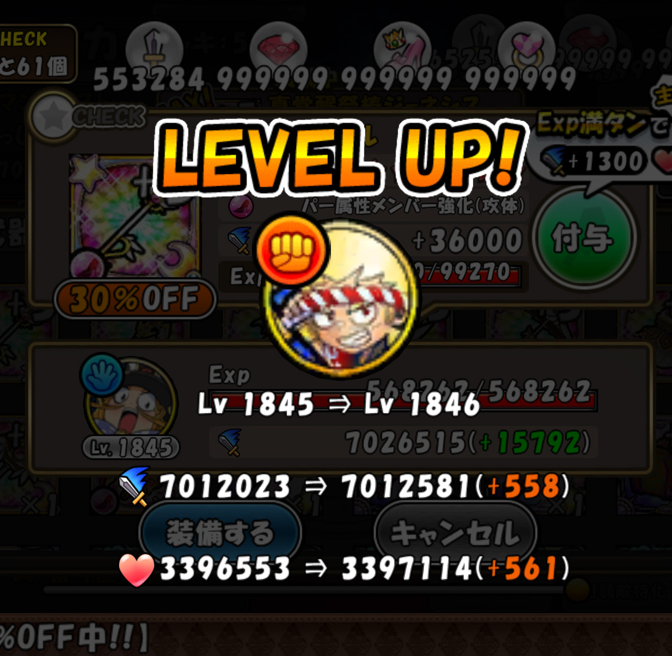 超絶お久方振りなレベルアップとなりました。何故したかと言いますと強化費用が30%オフだったからです。本当はもっと割り引いている時のほうが良いのですが...なんとなくやっちゃいました。まだまだ強化出来る武器がありますから上げられるのですが今はまだ1つ1つとと思いまして。と共にメンバーもレベルアップさせたいものですが、メンバーは値段が高いわけでして、ちょっと抵抗があります。せめて50%オフくらいではございませんと。ただ上げてしまうかも分かりません。はい。高難易度ステージに挑むことを考えまして。そうなのです。少し高難易度ステージに挑む気持ちになったわけなのでした。さてさて。明日はどうなりますやら。やるか否か。自分でも分かりません。まだ攻略も検索してませんしで。とは言え楽しみの多いケリ姫スイーツだと改めて感じます。是非ダウンロードをどうぞ。
