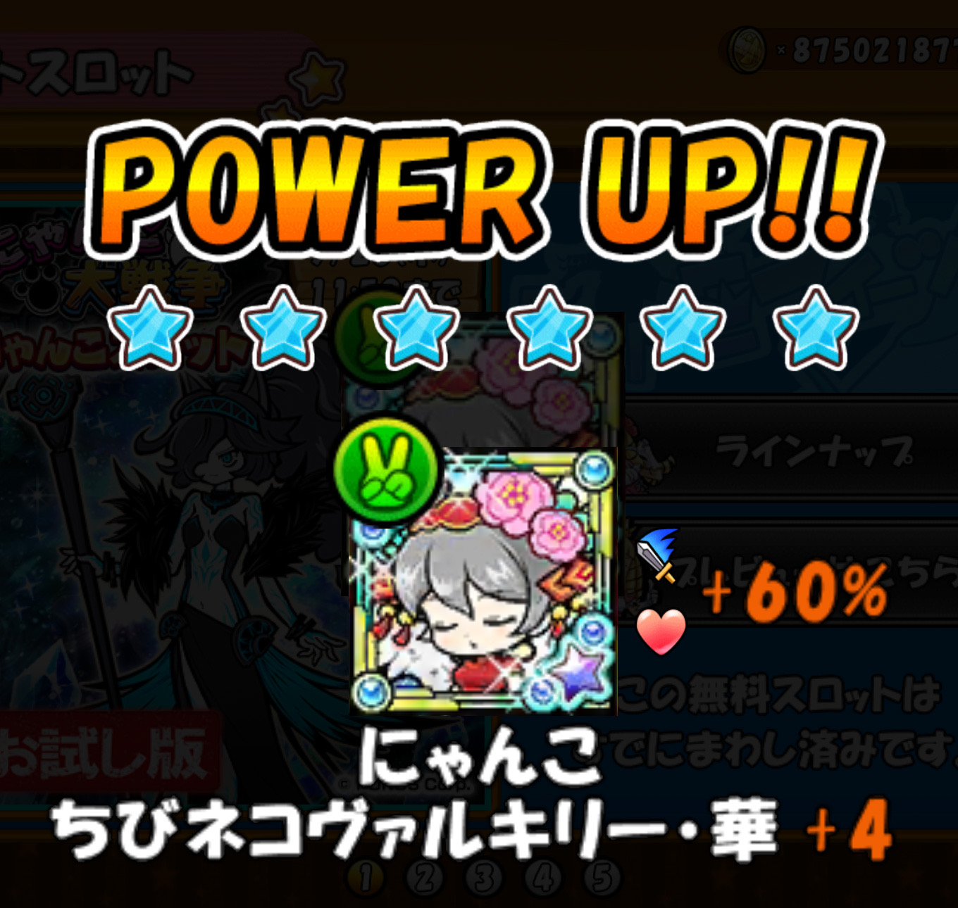 時間が無い時間が無いと連呼する日々ですが、もしかしますとゲームの中で1番ケリ姫スイーツが進められているかもわかりません。と言っても数回クリアしただけですけれども。他のゲームではログインしかしなかった昨日を考えると、十分遊んだ部類に入ります。しかも現在にゃんこ大戦争とのコラボでございますからね。遊びたくなる要素も満載なのでございました。さてさてさて。まずはこちら。スクリーンショットにあるのは。なんとお試しスロットでレアキャラクターが出ちゃうという嬉しさです。おお!えー!と驚きました。以前に入手はしていたのですが、まあ出てくれませんでしたので。有り難や。更にはまだまだ書きたいことございますが明日にします。全部書いてしまったらあした書くぶんがなくなってしまいますしね。ともかくコラボ。盛大に開催されてますので是非ケリ姫スイーツをお遊び下さいませ。